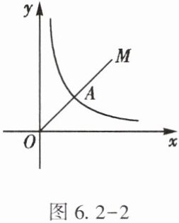 7. (★★)如图6.2-2,在平面直角坐标系中,第一象限的角平分线$OM$与反比例函数$y=\frac{k}{x}$的图象相交于点$A$,已知$OA$的长度为$4\sqrt{2}$。