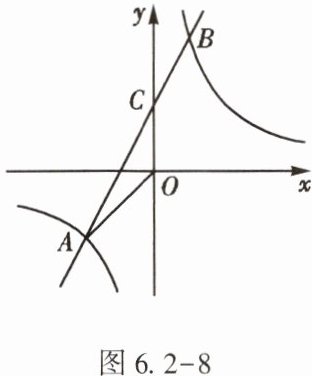 9. (★★)如图 6.2-8,已知 $ A(n, -2) $,$ B(1, 4) $ 是一次函数 $ y = kx + b $ 的图象和反比例函数 $ y = \frac{m}{x} $ 的图象的两个交点,直线 $ AB $ 与 $ y $ 轴交于点 $ C $。