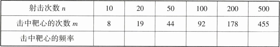 (2)由题中表格可知,随着射击次数的增加,击中靶心的频率稳定在0.9左右,所以击中靶心的概率约为0.9.