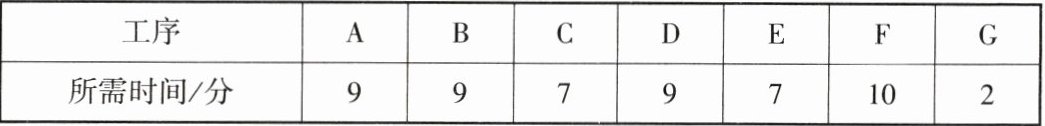 15.53 28 [提示]由题意,得$9+9+7+9+7+10+2=53$(分),即由一名学生单独完成此木艺艺术品的加工需要53分钟.假设这两名学生为甲、乙,因为工序C、D须在工序A完成后进行,工序E须在工序B、D 都完成后进行,且工序A、B都需要9分钟完成,所以可以安排如下:甲做工序A,乙同时做工序B,需要9 分钟。