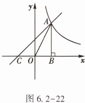 9. (★★)如图6.2-22,已知一次函数$y=x+1$的图象与反比例函数$y=\frac{k}{x}$的图象在第一象限相交于点$A$,与$x$轴相交于点$C$,$AB\perp x$轴于点$B$,$\triangle AOB$的面积为1,则$AC$的长为