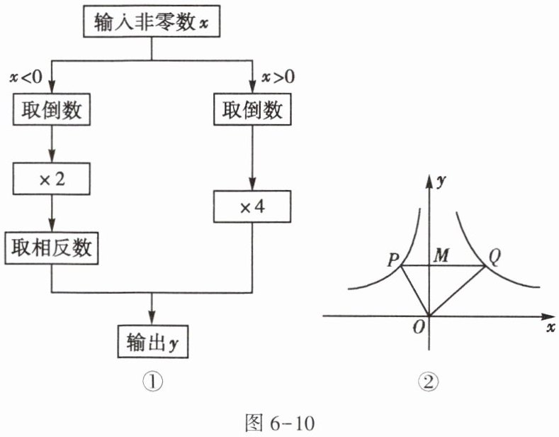 16. ($★★$)根据图$6 - 10$①所示的程序,得到了$y$与$x$的函数图象,如图$6 - 10$②.若点$M$是$y$轴正半轴上任意一点,过点$M$作$PQ// x$轴交图象于点$P$,$Q$,连接$OP$,$OQ$.则以下结论:①当$x < 0$时,$y = \dfrac{2}{x}$;②$\triangle OPQ$的面积为定值;③当$x > 0$时,$y$随$x$的增大而增大;④$MQ = 2PM$;⑤$\angle POQ$可以等于$90^{\circ}$.其中正确的结论是【 】