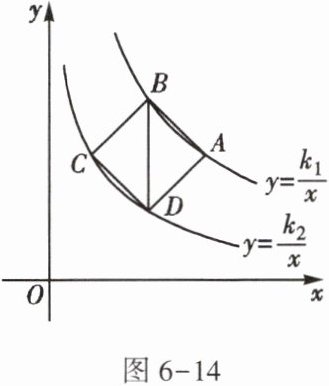 21. ($★★$)($2022$·十堰)如图$6 - 14$,正方形$ABCD$的顶点分别在反比例函数$y = \dfrac{k_{1}}{x}(k_{1} > 0)$和$y = \dfrac{k_{2}}{x}(k_{2} > 0)$的图象上.若$BD// y$轴,点$D$的横坐标为$3$,则$k_{1} + k_{2}$等于【 】