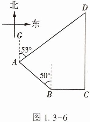 10. (★★)(2022·丹东)如图1.3-6,我国某海域有A,B,C三个港口,B港口在C港口正西方向33.2n mile(n mile是单位“海里”的符号)处,A港口在B港口北偏西50°方向且距离B港口40n mile处,在A港口北偏东53°方向且位于C港口正北方向的点D处有一艘货船,求货船与A港口之间的距离。(参考数据:sin50°≈0.77,cos50°≈0.64,tan50°≈1.19,sin53°≈0.80,cos53°≈0.60,tan53°≈1.33)