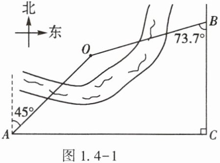 15. (★★)某区域平面示意图如图$1.4 - 1$所示,点$O$在河的一侧,$AC$和$BC$表示两条互相垂直的公路。甲勘测员在$A$处测得点$O$位于北偏东$45^{\circ}$,乙勘测员在$B$处测得点$O$位于南偏西$73.7^{\circ}$,且$AC = 840m$,$BC = 500m$。请求出点$O$到$BC$的距离。(参考数据:$\sin 73.7^{\circ}\approx\frac{24}{25}$,$\cos 73.7^{\circ}\approx\frac{7}{25}$,$\tan 73.7^{\circ}\approx\frac{24}{7}$)