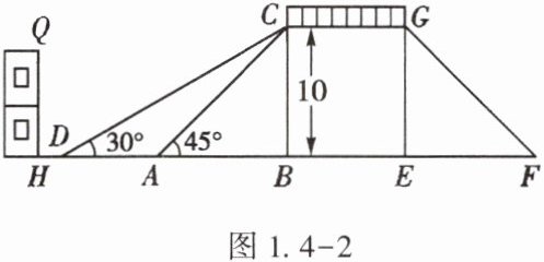 16. (★★)图$1.4 - 2$是某市一座人行天桥的示意图,天桥离地面的高$BC$是$10$米,坡面$10$米处有一建筑物$HQ$,为了方便行人推车过天桥,市政府部门决定降低坡度,使新坡面$DC$的倾斜角$\angle BDC = 30^{\circ}$,若新坡面下$D$处与建筑物之间需留下至少$3$米宽的人行道,问:该建筑物是否需要拆除?(计算最后结果保留一位小数。参考数据:$\sqrt{2}\approx1.414$,$\sqrt{3}\approx1.732$)