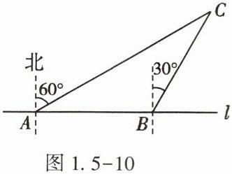 12. (★★)如图1.5-10,某市郊外景区内一条笔直的公路l经过A,B两个景点,景区管委会又开发了风景优美的景点C.经测量,C位于A的北偏东60°的方向上,C位于B的北偏东30°的方向上,且AB=10km.