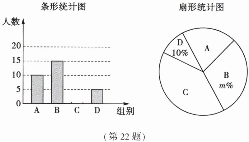 22. (12 分)(2023·张家界)2022 年 4 月 21 日《义务教育课程方案和课程标准(2022 年版)》正式颁布,优化了课程设置,其中将劳动教育从综合实践活动课程中独立出来. 某校为了初步了解学生的劳动教育情况,对九年级学生“参加家务劳动的时间”进行了抽样调查,并将劳动时间 $x$ 分为如下四组(A:$x < 70$;B:$70\leqslant x < 80$;C:$80\leqslant x < 90$;D:$x\geqslant 90$,单位:分)进行统计,绘制了如下不完整的统计图.