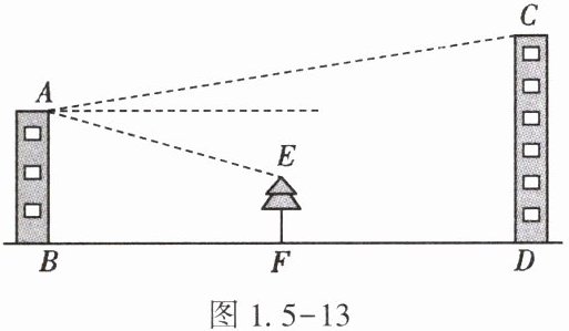 15. (★★)(2022·淄博)如图1.5-13,希望中学的教学楼AB和综合楼CD之间生长着一棵高度为12.88米的白杨树EF,且三者底端B,D,F在同一直线上,BF=FD=40米.在综合实践活动课上,小明打算借助这棵树的高度测算出综合楼的高度,他在教学楼顶A处测得点C的仰角为9°,点E的俯角为16°.问:小明能否运用以上数据,得到综合楼的高度?若能,请求出其高度(结果精确到0.01米);若不能,请说明理由.