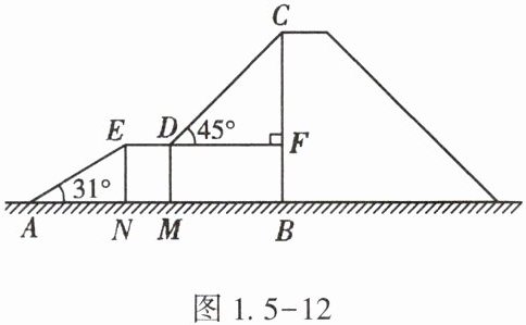 14. (★★)图1.5-12是某儿童乐园为小朋友设计的滑梯平面图.已知BC=4米,AB=6米,中间平台宽度DE=1米,EN,DM,CB为三根垂直于AB的支柱,垂足分别为N,M,B,∠EAB=31°,DF⊥BC于点F,∠CDF=45°.求DM和BC间的水平距离BM.(结果精确到0.1米,参考数据:$\sin31°≈0.52$,$\cos31°≈0.86$,$\tan31°≈0.60$)