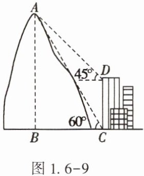 11. (★★)某中学数学活动小组为测量教学楼后面的山高 AB,用了如下的方法. 如图 1.6 - 9 所示,在教学楼底 C 处测得山顶 A 的仰角为 $ 60° $,在教学楼顶 D 处测得山顶 A 的仰角为 $ 45° $. 已知教学楼高 $ CD = 12 $ 米,求山高 AB.(结果精确到 0.1 米,参考数据:$ \sqrt{2} \approx 1.41 $,$ \sqrt{3} \approx 1.73 $,化简后再代入参考数据运算)