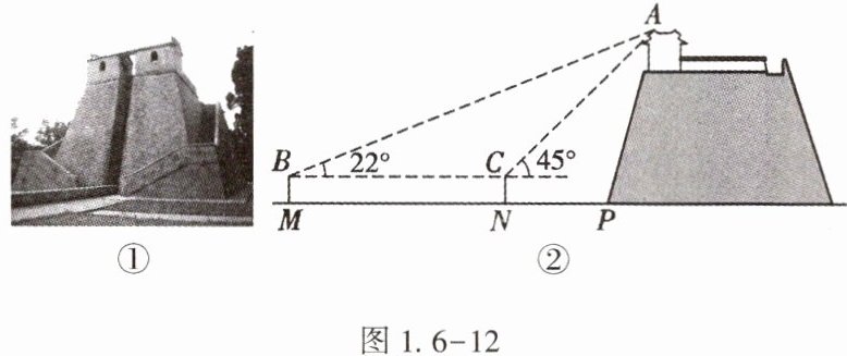 某校数学社团的同学们使用卷尺和自制的测角仪测量观星台的高度. 如图 1.6 - 12②所示,他们在地面一条水平步道 MP 上架设测角仪,先在点 M 处测得观星台最高点 A 的仰角为 $ 22° $,然后沿 MP 方向前进 16m 到达点 N 处,测得点 A 的仰角为 $ 45° $,测角仪的高度为 1.6m.