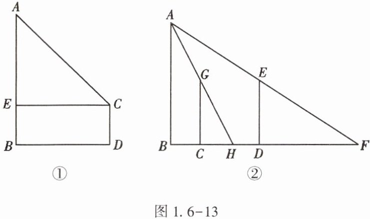 (2)我国古代数学家赵爽利用影子对物体进行测量的方法至今仍有借鉴意义. 如图 1.6 - 13②,现将一高度为 2 米的木杆 CG 放在灯杆 AB 前,测得其影长 CH 为 1 米,再将木杆沿着 BC 方向移动 1.8 米至 DE 的位置,此时测得其影长 DF 为 3 米,求灯杆 AB 的高度.