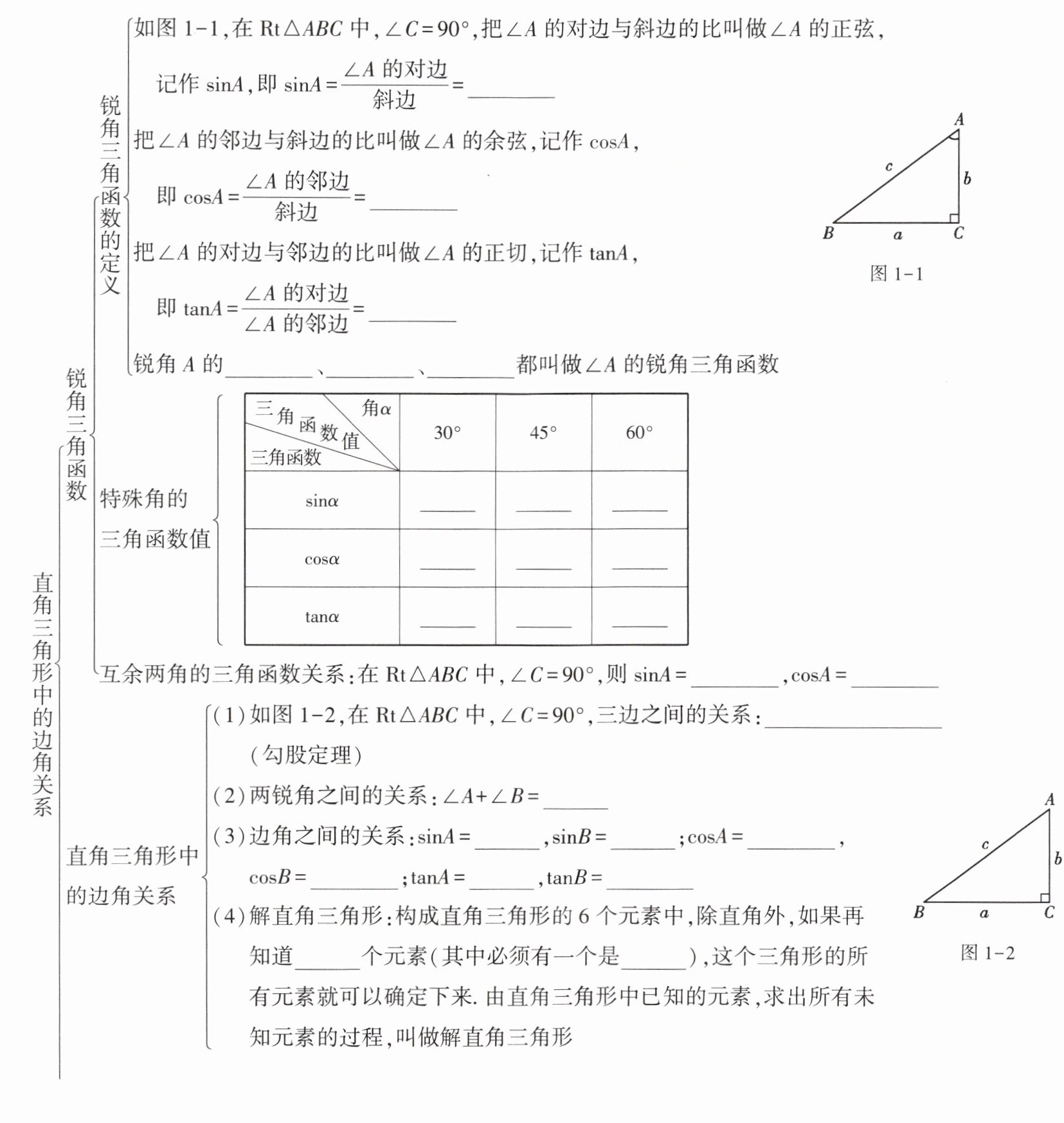 $\frac{a}{c}$ $\frac{b}{c}$ $\frac{a}{b}$ 正弦 余弦 正切 $\frac{1}{2}$ $\frac{\sqrt{2}}{2}$