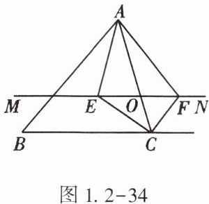 16. (★★)如图1.2-34,在$ △ABC $中,O是AC边上的一个动点,过点O作直线$ MN // BC $,设MN交$ ∠BCA $的平分线于点E,交$ ∠BCA $的邻补角的平分线于点F。
