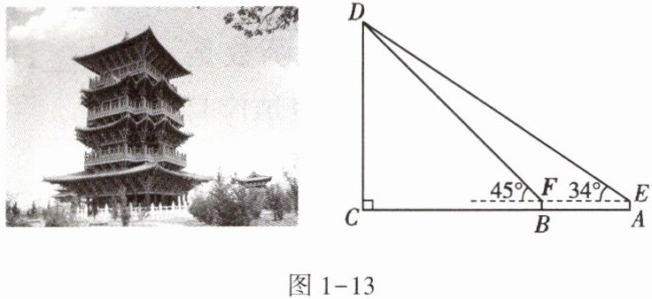 22. (★★) (2022·河南) 开封清明上河园是依照北宋著名画家张择端的《清明上河图》建造的,拂云阁是园内最高的建筑。某数学小组测量拂云阁 $DC$ 的高度,如图 1 - 13,在 $A$ 处用测角仪测得拂云阁顶端 $D$ 的仰角为 $34^{\circ}$,沿 $AC$ 方向前进 15m 到达 $B$ 处,又测得拂云阁顶端 $D$ 的仰角为 $45^{\circ}$。已知测角仪的高度为 1.5m,测量点 $A$,$B$ 与拂云阁 $DC$ 的底部 $C$ 在同一水平线上,求拂云阁 $DC$ 的高度。(结果精确到 1m。参考数据:$\sin 34^{\circ} \approx 0.56$,$\cos 34^{\circ} = 0.83$,$\tan 34^{\circ} \approx 0.67$)