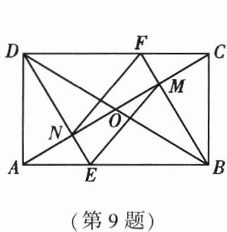 9. 如图,矩形 $ABCD$ 中,$AC$,$BD$ 相交于点 $O$,过点 $B$ 作 $BF\perp AC$ 交 $CD$ 于点 $F$,交 $AC$ 于点 $M$,过点 $D$ 作 $DE// BF$ 交 $AB$ 于点 $E$,交 $AC$ 于点 $N$,连接 $FN$,$EM$。则下列结论:① $DN = BM$;② $EM// FN$;③ $AE = FC$;④当 $AO = AD$ 时,四边形 $DEBF$ 是菱形. 其中正确结论的个数是(