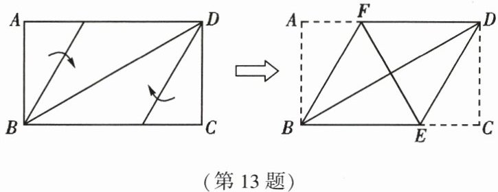 13. 将矩形纸片 $ABCD$ 按如图所示的方式折叠,点 $A$、点 $C$ 恰好落在对角线 $BD$ 上,得到菱形 $BEDF$,若 $BC = 6$,则 $AB$ 的长为