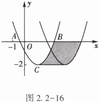 16. (★★)如图 2.2 - 16,已知抛物线 $ y = ax^2 + bx + c $ 与 $ x $ 轴交于 $ A $,$ B $ 两点,顶点 $ C $ 的纵坐标为 $ -2 $,现将抛物线向右平移 2 个单位长度,得到抛物线 $ y = a_1x^2 + b_1x + c_1 $,则有下列结论:① $ b > 0 $;② $ a - b + c < 0 $;③阴影部分的面积为 4;④若 $ c = -1 $,则 $ b^2 = 4a $。其中正确的序号有______。