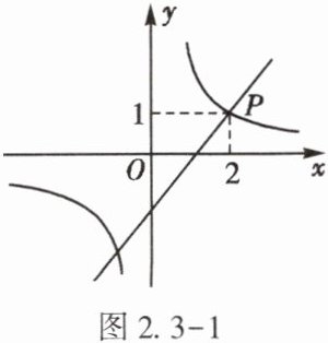 2. (★)如图 2.3 - 1,一双曲线和直线 $ y = kx - 1 $ 都经过点 $ P $,请写出它们的表达式: