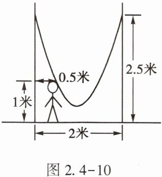 2. (★)如图 2.4 - 10,小明的父亲在相距 2 米的两棵树间拴了一根绳子,给小明做了一个简易的秋千。拴绳子的地方距地面高都是 2.5 米,绳子自然下垂呈抛物线状,身高 1 米的小明距较近的那棵树 0.5 米时,头部刚好接触到绳子,则绳子的最低点距地面的距离为