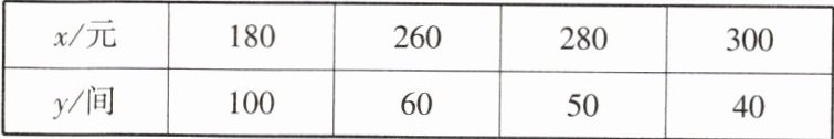 12. (★★)某宾馆拥有客房 100 间,经营中发现:每天入住的客房数 $ y $ (间)与房价 $ x $ (元) $ (180 \leq x \leq 300) $ 满足一次函数关系,部分对应值如下表: