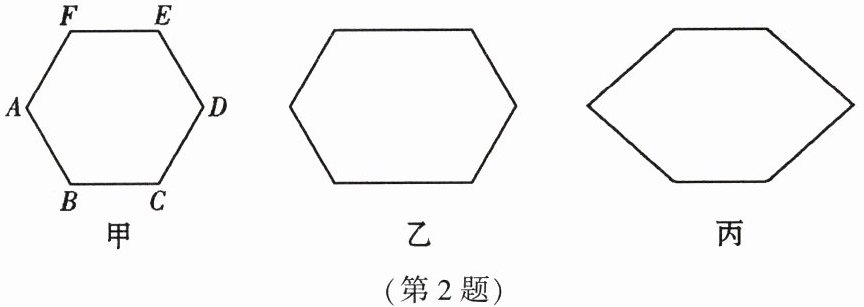 2. 如图,图甲是一个正六边形$ABCDEF$,使线段$BC$,$FE$增加相等的长度,得图乙,将图甲中的点$A$,$D$分别向两边拉长相等的量,得图丙。则下面说法正确的是 (