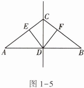 5. (★★)如图 1 - 5,D 是线段 AB 的中点,C 是线段 AB 的垂直平分线上的任意一点,DE⊥AC 于点 E,DF⊥BC 于点 F。