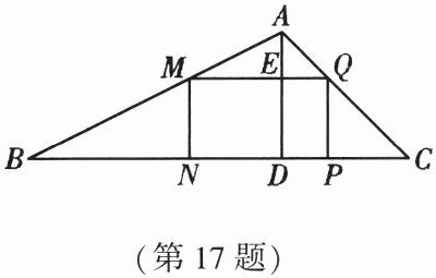 17. (7分)如图,在$\triangle ABC$中,$BC = 48cm$,高$AD = 16cm$,它的内接矩形$MNPQ$的两邻边$MN$与$MQ$之比为$5:9$,求此矩形的周长。