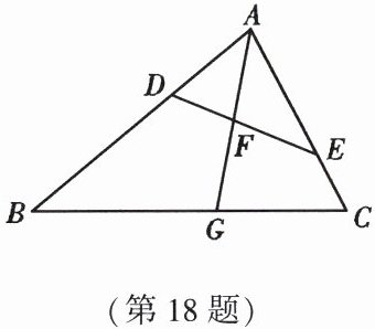 18. (8分)如图,在$\triangle ABC$中,点$D$,$E$分别在边$AB$,$AC$上,$\angle AED = \angle B$,射线$AG$分别交线段$DE$,$BC$于点$F$,$G$,且$\frac{AD}{AC} = \frac{DF}{CG}$。