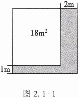 9. (★)公园有一块正方形的空地,后来从这块空地上划出部分区域栽种鲜花(如图2.1 - 1),原空地一边减少了1m,另一边减少了2m,剩余空地的面积为$18m^2$,求原正方形空地的边长。设原正方形空地的边长为$x$m,则可列方程为【 】