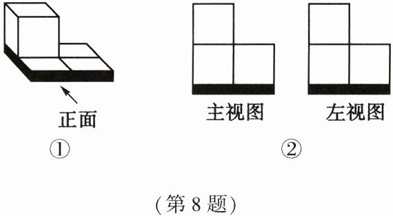 8. 如图①,一个 $ 2 × 2 $ 的平台上已经放了一个棱长为 1 的正方体,要得到一个几何体,其主视图和左视图如图②,平台上至少还需再放这样的正方体 (