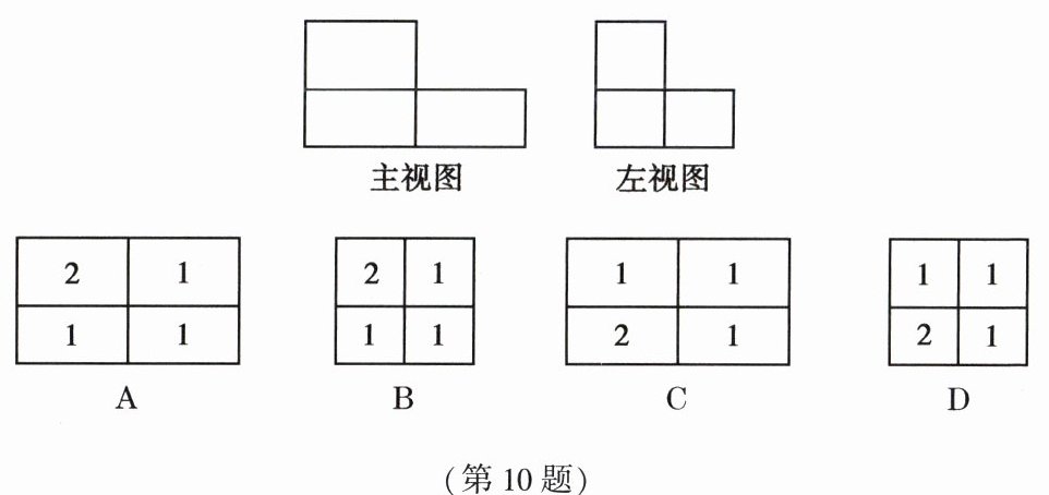 10. 由 5 个完全相同的小长方体搭成的几何体的主视图和左视图如图所示,则这个几何体的俯视图是 (