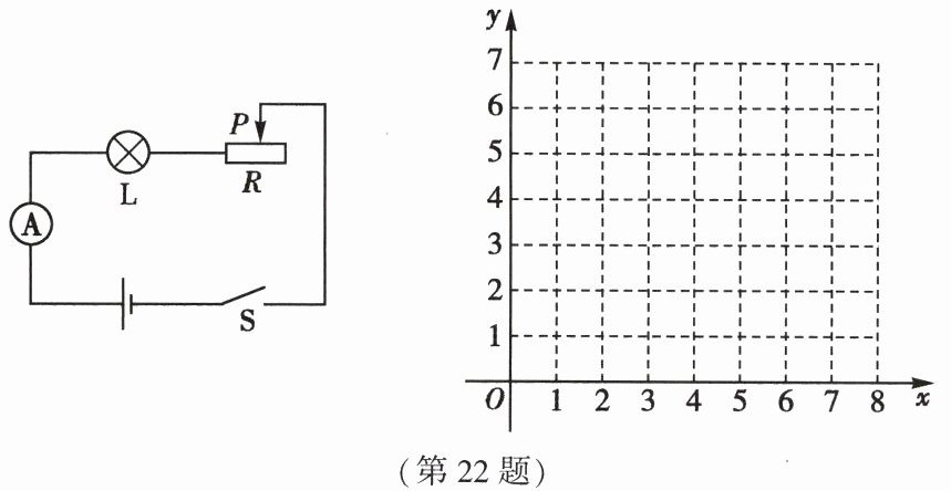 22. (8 分)(2023·达州)【背景】在一次物理实验中,小冉同学用一固定电压为 12V 的蓄电池,通过调节滑动变阻器来改变电流大小,完成控制灯泡 L(灯丝的阻值 $ R_L = 2\Omega $)亮度的实验(如图)。已知串联电路中,电流与电阻 $ R $、$ R_L $ 之间关系为 $ I = \frac{U}{R + R_L} $,通过实验得出如下数据: