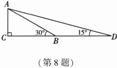 8. 构建几何图形解决代数问题体现了“数形结合”思想的重要性。在计算 $ \tan 15^{\circ} $ 时,如图,在 $ Rt\triangle ACB $ 中,$ \angle C = 90^{\circ} $,$ \angle ABC = 30^{\circ} $,延长 $ CB $ 到点 $ D $,使 $ BD = AB $,连接 $ AD $,得 $ \angle D = 15^{\circ} $,所以 $ \tan 15^{\circ} = \frac{AC}{CD} = \frac{1}{2 + \sqrt{3}} = \frac{2 - \sqrt{3}}{(2 + \sqrt{3})(2 - \sqrt{3})} = 2 - \sqrt{3} $。类比这种方法,计算 $ \tan 22.5^{\circ} $ 的值为(