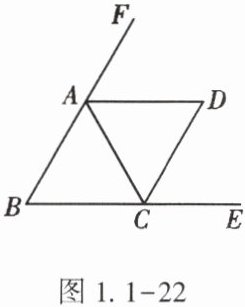 15. (★★)如图 1.1 - 22,在$\triangle ABC$中,$AB = AC$,$\angle B = 60^{\circ}$,$\angle FAC$和$\angle ECA$是$\triangle ABC$的两个外角,$AD$平分$\angle FAC$,$CD$平分$\angle ECA$. 求证:四边形$ABCD$是菱形.