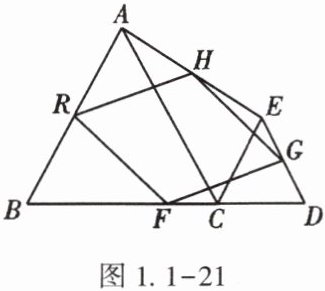 14. (★★)如图 1.1 - 21,$C$是线段$BD$上一点,$\triangle ABC$和$\triangle ECD$都是等边三角形,$R$,$F$,$G$,$H$分别是四边形$ABDE$各边的中点,求证:四边形$RFGH$是菱形.