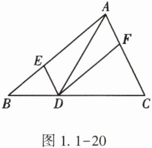 13. (★★)如图 1.1 - 20,在$\triangle ABC$中,点$D$,$E$,$F$分别在边$BC$,$AB$,$AC$上,且$DE// AC$,$DF// AB$. 有下列三种说法:①四边形$AEDF$是平行四边形;②如果$AD$平分$\angle BAC$,那么四边形$AEDF$是菱形;③如果$AD\perp BC$且$AB = AC$,那么四边形$AEDF$是菱形. 其中,正确的有