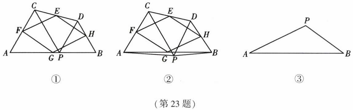 23. (11 分)(1)【问题情境】如图①,$P$ 是线段 $AB$ 上一点,分别以 $AP$,$BP$ 为边在 $AB$ 的同侧作等边三角形 $APC$ 和等边三角形 $BPD$,$E$,$F$,$G$,$H$ 分别是 $DC$,$CA$,$AB$,$BD$ 的中点,猜想四边形 $EFGH$ 是什么特殊四边形,请直接写出答案。