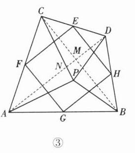 (3)【拓展应用】如图③,点 $P$ 在 $AB$ 的上方,在直线 $AB$ 的上方作 $PC = PA$,$PD = PB$,$\angle APC = \angle BPD = 90^{\circ}$,$E$,$F$,$G$,$H$ 分别是 $DC$,$CA$,$AB$,$BD$ 的中点。请画出合适的图形,试猜想四边形 $EFGH$ 是什么特殊四边形,并说明理由。