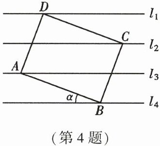 4. 如图,矩形$ABCD$的四个顶点分别在直线$l_{1},l_{2},l_{3},l_{4}$上.若直线$l_{1}// l_{2}// l_{3}// l_{4}$且间距相等,$AB = 4,BC = 3$,则$\tan\alpha$的值为 (