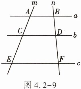 10. (★)如图 4.2-9,已知直线$a// b// c$,直线$m$,$n$与直线$a$,$b$,$c$分别交于点$A$,$C$,$E$和点$B$,$D$,$F$,$AC = 4$,$CE = 6$,$BD = 3$,则$BF =$