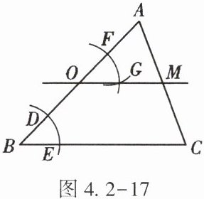 18. (★★)(2024·长春)如图 4.2-17,在中,是边的中点。按下列要求作图:①以点为圆心、适当长为半径画弧,交线段于点,交于点;②以点为圆心、长为半径画弧,交线段于点;③以点为圆心、长为半径画弧,交前一条弧于点,点与点在直线同侧;④作直线,交于点。下列结论不一定成立的是【 】