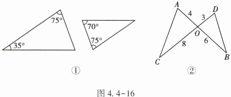 3. (★) 已知如图 4.4 - 16①所示的两个三角形,其边长和角的度数已在图上标出. 在图 4.4 - 16②中,AB,CD 相交于 O 点. 对于两图中的两个三角形而言,下列说法正确的是【 】