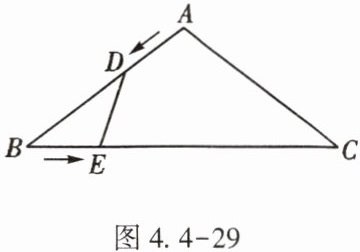 15. (★★★) 如图 4.4 - 29,在△ABC 中,AB = AC = 10cm,BC = 16cm. 点 D 由点 A 出发沿 AB 方向向点 B 匀速运动,同时点 E 由点 B 出发沿 BC 方向向点 C 匀速运动,它们的速度均为 1cm/s. 连接 DE,设运动时间为 t(s) (0 < t < 10),解答下列问题:
