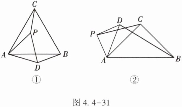 .(2) 类比探究:如图 4.4 - 31②,当 α = 90°时,请写出 BD/CP 的值及直线 BD 与直线 CP 相交所成的较小角的度数,并就图 4.4 - 31②的情形说明理由.
