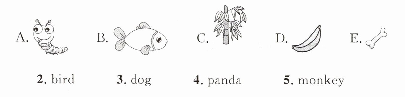 1. cat 2. bird 3. dog 4. panda 5. monkey