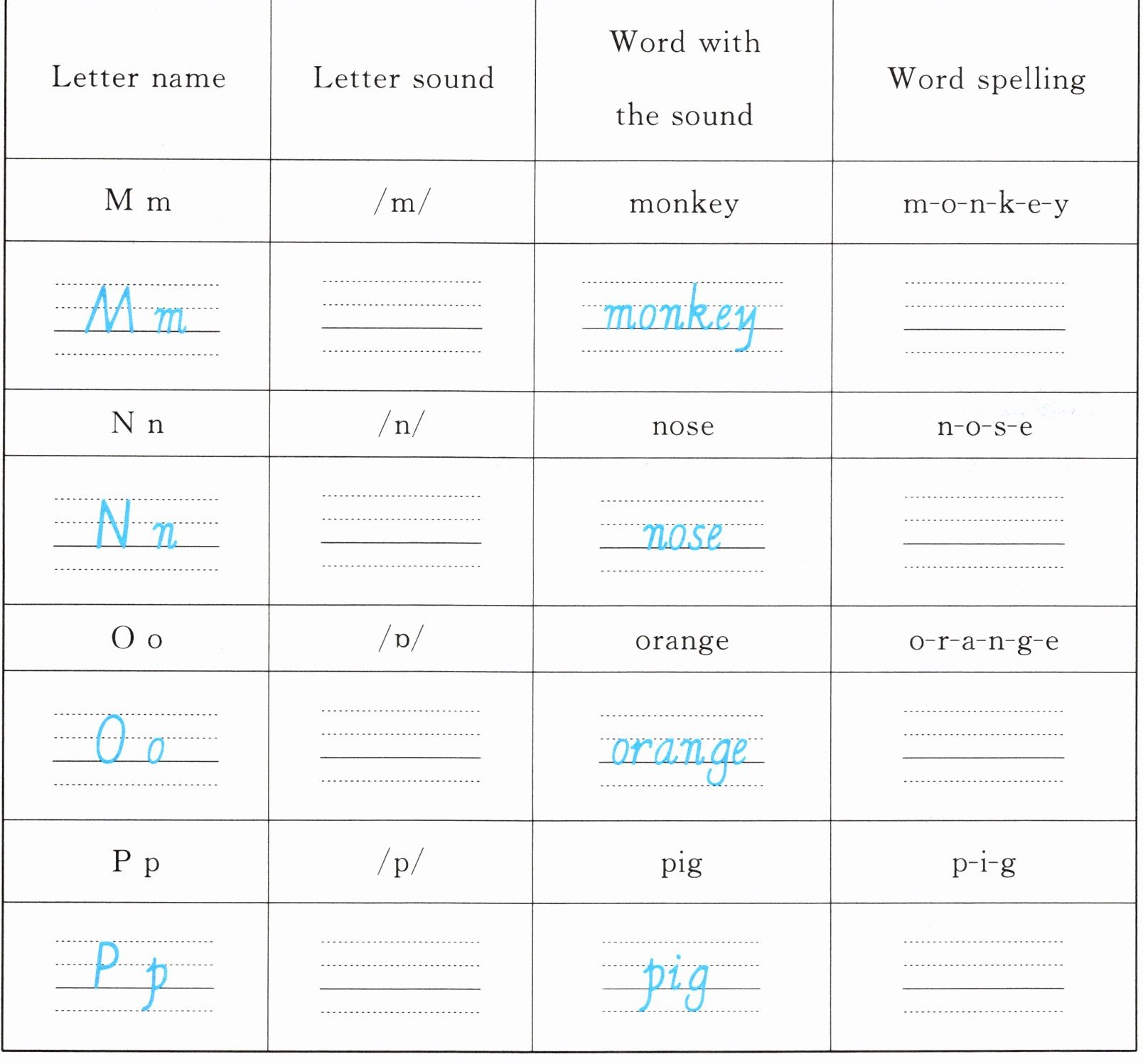 | Letter name | Letter sound | Word with the sound | Word spelling |