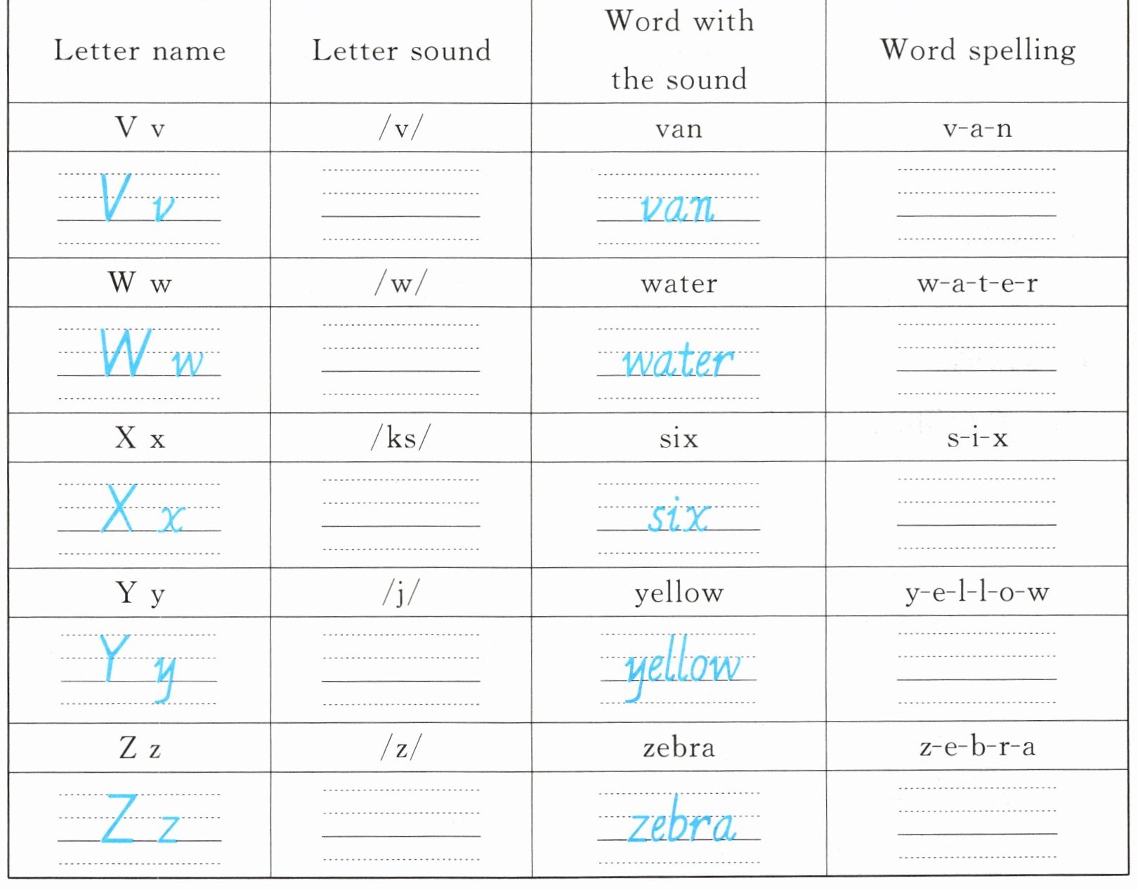 | Z z | /z/ | zebra | z-e-b-r-a |