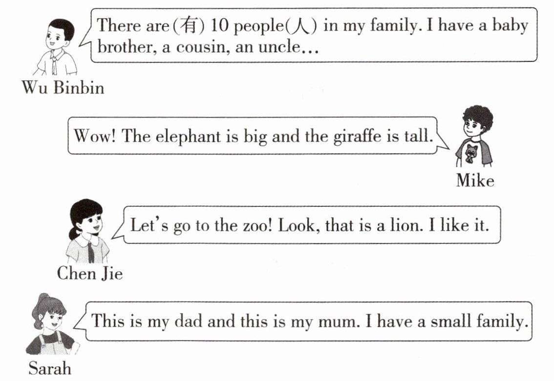 1.C 解析:根据Sarah说的话“I have a small family.”可知,Sarah有一个小家庭。2.B 解析:根据Wu Binbin说的话“There are 10 people in my family.”可知,Wu Binbin有个大家族。3.C 解析:通读材料可知,Wu Binbin和Sarah讲的是家庭,Mike和Chen Jie讲的是动物。4.B 解析:根据Mike说的话“The elephant is big and the giraffe is tall.”可知,大象很大,长颈鹿很高。5.B 解析:根据Chen Jie说的话“Look,that is a lion. I like it.”可知,Chen Jie喜欢那只狮子。